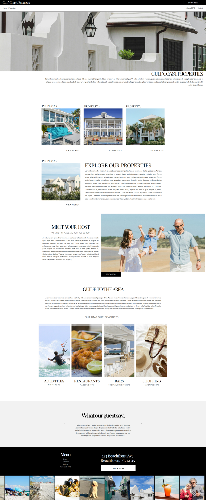 While we showcase this template with coastal styling, the design is completely customizable for any vacation rental portfolio. Whether you manage beachfront condos, lakefront cabins, urban lofts, wine country estates, or mountain retreats across multiple locations, this template adapts to showcase your entire property collection perfectly. The flexible layout and customizable elements work for any combination of rental types, allowing you to present a cohesive brand across your diverse portfolio.